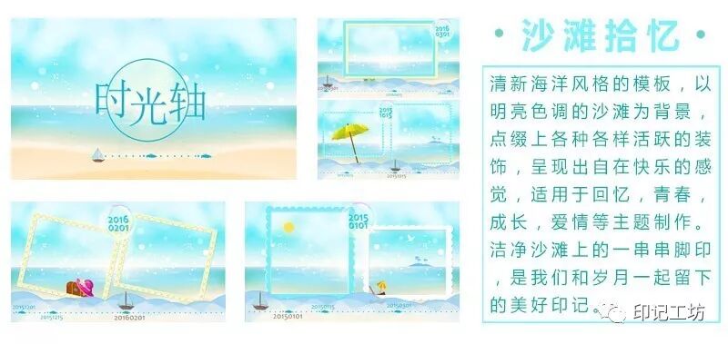 清新海洋的风格,漂浮在气泡中的时间,时间播放着快乐的故事、六种转场特效与可爱卡通的边框动画,以明亮色调的沙滩为背景,各种各样活跃的装饰,洁净沙滩上的一串串脚印,是我们快乐的时光![]()
