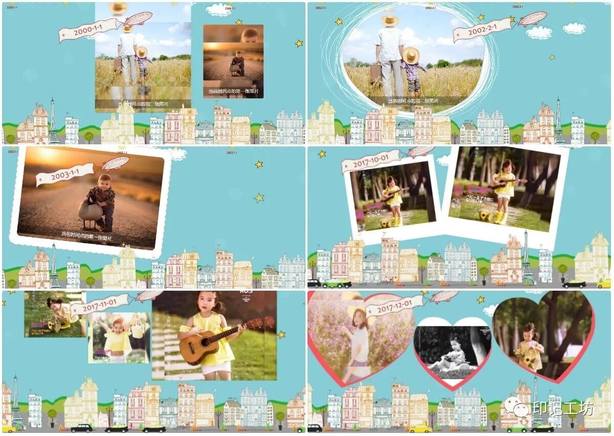 卡通都市的背景,跑动的小汽车、星星点缀的天空,卡通飞机拖着记录的时间表,带着记忆的图片缓缓飞出来、六种不同效果边框展现的特效,还有马赛克化图片播放的特效。卡通风格的模版适于儿童、生日、成长以及有关童年的视频相册制作。