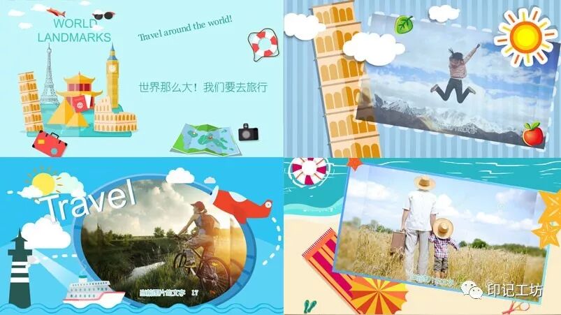 漂亮的蓝天白云,大手牵着小手,穿梭在世界各地的名胜建筑,软萌萌的卡通可爱风设计呼唤着,带我们去旅行吧。